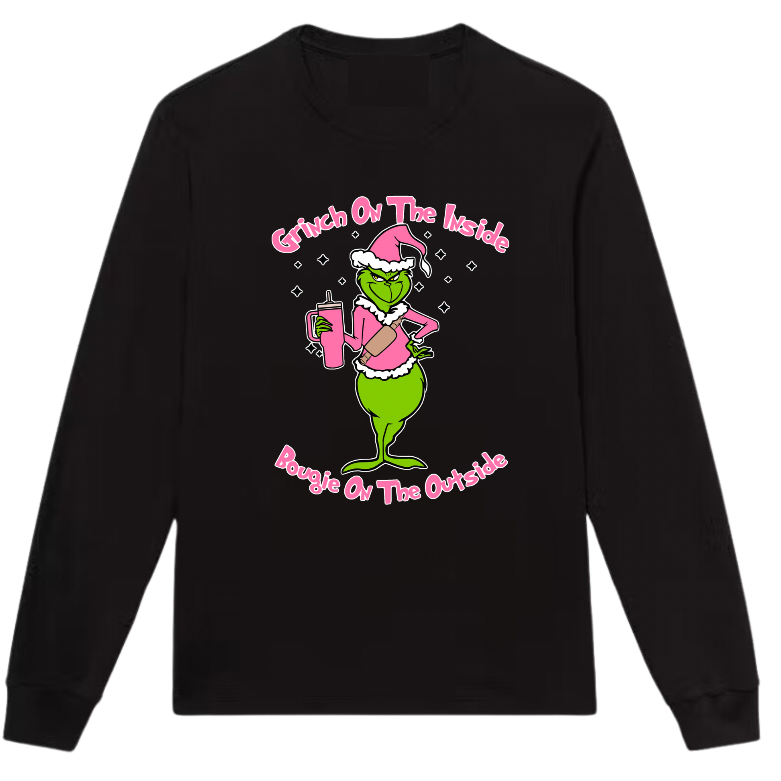Unleash your inner Grinch with this playful and trendy sweater! Featuring the phrase "Grinch on the inside, boujie on the outside" in vibrant pink lettering, and a cute Grinch graphic, this black sweater is a must-have for any quirky fashionista. Get ready to spread some holiday cheer with this boujie and stylish piece!